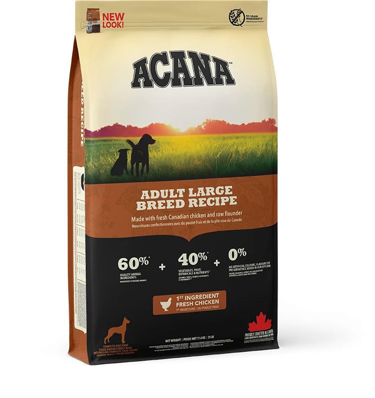 Bereid in onze gecertificeerde keukens in Canada is Acana Dog hondenvoer Adult Large Breed rijk aan lokaal gefokte scharrel kip, scharrel eieren, in het wild gevangen platvis, zongerijpt fruit en groenten- geleverd rijk aan voedingsstoffen en door boeren en telers uit onze eigen regio zodat jouw hond in optimale fysieke conditie blijft. Deze voeding is rijk aan dierlijk eiwit en minimaal in percentage koolhydraten.