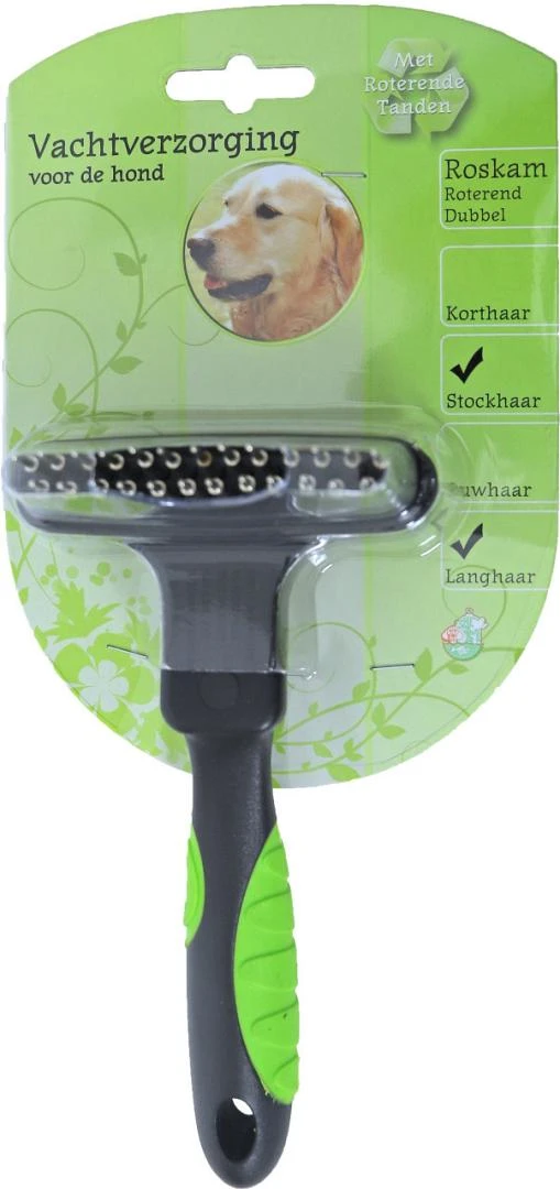 De roskam met roterende pennen dubbel is uitermate geschikt voor het ontklitten of ontwollen van de vacht. Deze roskam is uitermate geschikt voor alle honden met een onder- en bovenvacht. Door de ergonomische vorm is deze kam minder belastend voor jouw lichaam, de roterende tanden zorgen ervoor dat de kam gemakkelijker door de vacht glijdt.