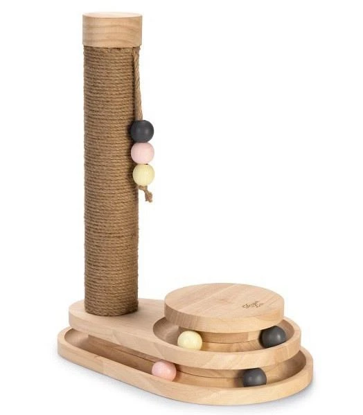 De Designed by Lotte Krabpaal Inez is een multifunctionele krabpaal. Deze krabpaal heeft naast de gebruikelijke krabstam ook nog een leuke speeltoren aan de voet bevestigd. Deze speeltoren is voorzien van balletjes. Zodra jouw kat met zijn poot of snuit tegen de balletjes tikt, zullen deze alle kanten op rollen.
