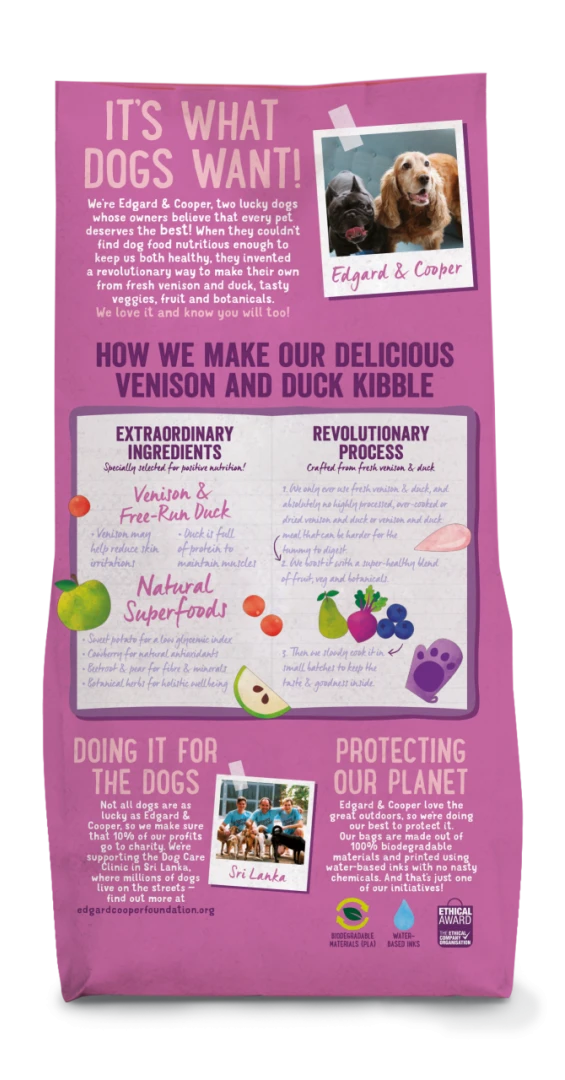 In Edgard & Cooper hondenvoer Adult hert en scharreleend wordt enkel vers hert en verse scharreleend gebruikt en absoluut geen bewerkt, overgaar of gedroogd hert en eend of meel van hert of eend dat moeilijker is voor de buikjes om te verteren. Daarnaast wordt er een supergezonde mix van fruit, groenten en kruiden toegevoegd.