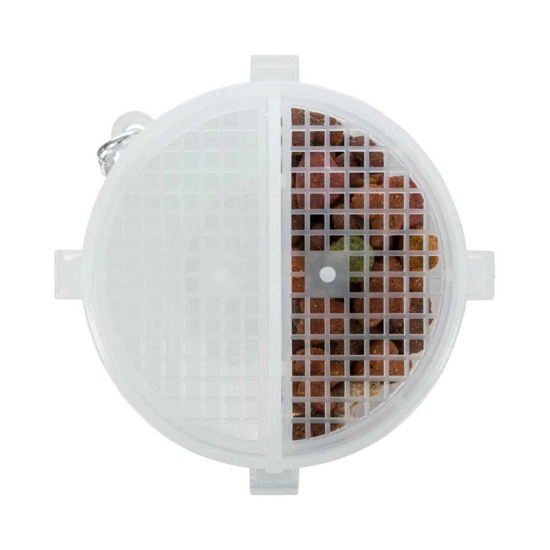 Voer- en Waterreservoir met twee gescheiden kamers met waterdicht deksel.In het deksel zitten twee openingen voor een afzonderlijk gebruik van de kamers.Met karabijnhaak en inclusief siliconen reisbak.