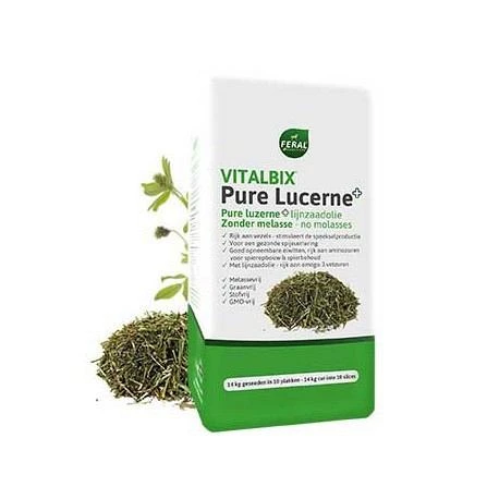 Vitalbix Pure Lucerne+ is een pure luzerne voor paarden en pony’s. Het bevat 3% lijnzaadolie en is vrij van melasse of andere toevoegingen. Luzerne stimuleert de speekselproductie van het paard waarmee het helpt maagzweren te voorkomen. Pure Lucerne+ is een bron van vezels.
