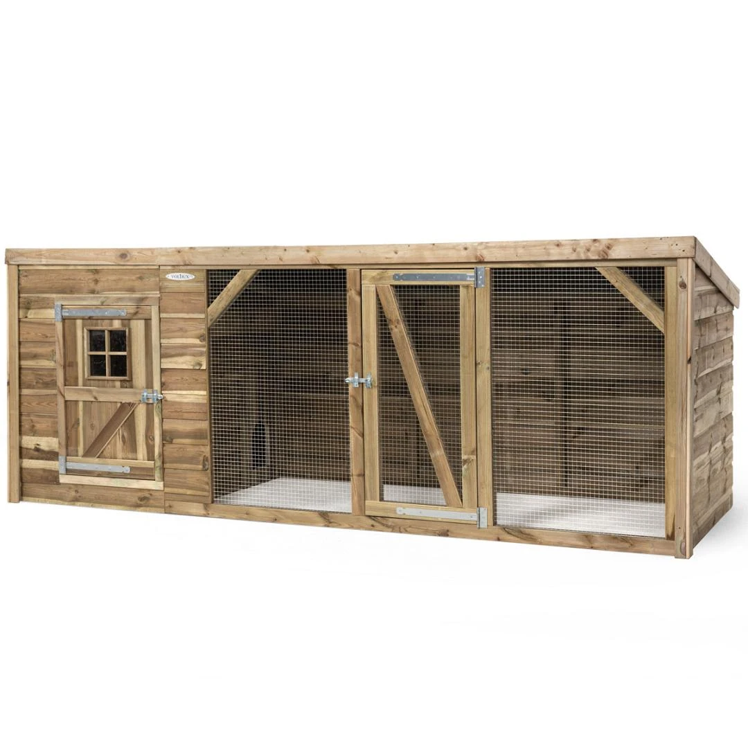 Voldux Kippen- of konijnenhok Brit XL biedt een groot nachthok én een ruime ren voor jouw kippen en konijnen. Het handgemaakte hok heeft een totale afmeting van 342 x 130 x 132 cm en wordt geproduceerd uit onderhoudsvrije materialen. Het nachthok is opgebouwd uit geïmpregneerde houten balken en is afgewerkt met rabatdelen, wat zorgt voor een stevige constructie.