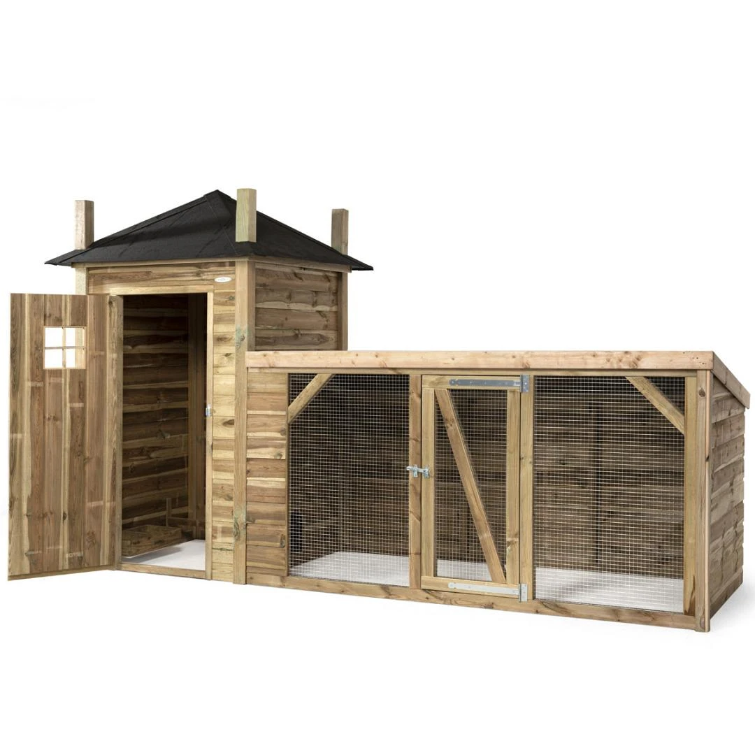 Het nachthok is ontworpen met de kenmerken van een klassieke hooiberg. Het stevige frame van het nachthok is gemaakt van geïmpregneerde balken, welke op een sierlijke manier het dak ondersteunen. Het nachthok is afgewerkt met geïmpregneerd rabatdelen en voorzien van een grote toegangsdeur aan de voorzijde. Via een open doorgang kunnen jouw kippen of konijnen zelf eenvoudig de ren binnen scharrelen. Deze ruime ren heeft een afmeting van 255 x 150 cm, waardoor er een enorme scharrel- of speelruimte ontstaat voor jouw kippen of konijnen.