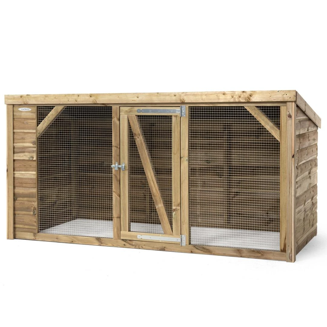Voldux Kippen- of konijnenren Brit biedt een heerlijke scharrel- en speelruimte aan jouw kippen en konijnen, met een buitenafmeting van 260 x 130 x 132 cm. De ren is gemaakt van onderhoudsvrije materialen. Zo is de ren opgebouwd op geïmpregneerde houten balken, welke een stevig frame vormen. Voor de afwerking is gekozen voor geïmpregneerd rabat. Deze materialen vragen geen jaarlijkse schilder- of beitsbeurt en bieden toch een levensduur van 10 tot 15 jaar.